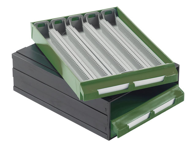- Posibilidad de equipar cada cajón con hasta 5 soportes de 40 portaobjetos geológicos para microscopio.