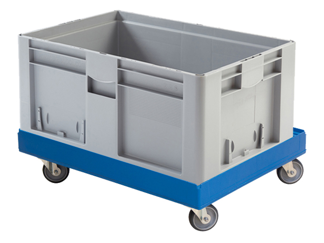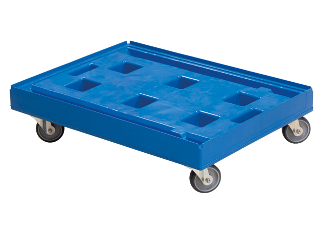 Base plástica fabricada en polietileno (PE) para cajas Norma Europa EUROBOX de 800x600 mm. Equipada con 2 ruedas móviles y 2 fijas de Ø125 mm.